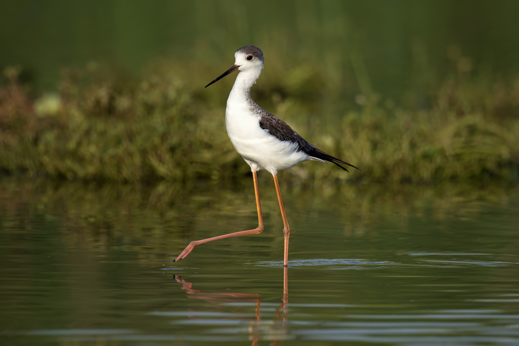 Aptly named Stilt, with long needle-like pink legs, this is a resident breeder and winter visitor. It is found in shallow areas of water, from lakes and ponds to industrial lagoons. When disturbed it flies off, calling noisily. Using its long legs it can wade slowly and delicately in water and mud to find the small aquatic animals on which it feeds. Males and females are similar, though in breeding dress the males sometime have black on the head.