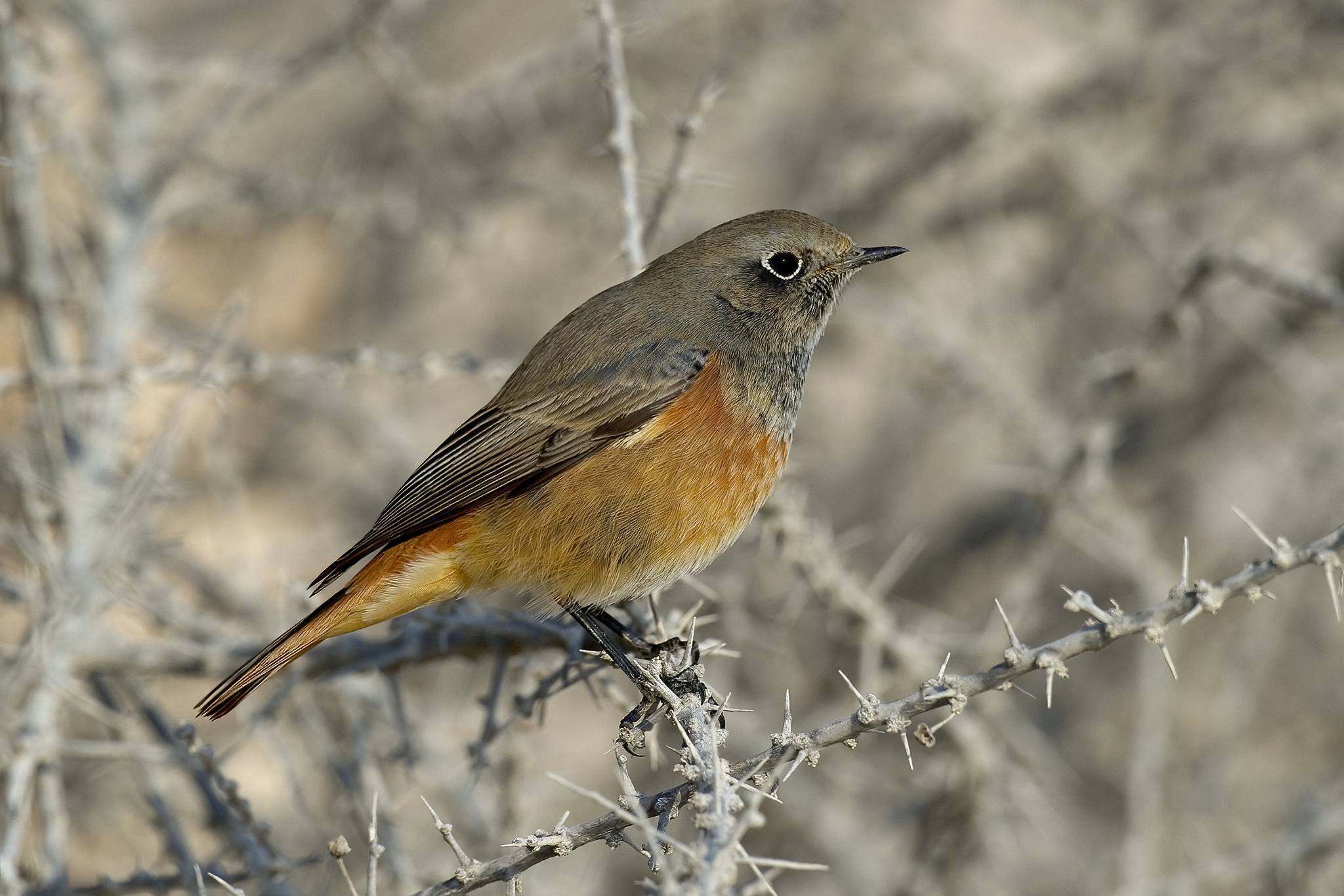 The Common Redstart is a migratory bird seen in Qatar during spring and autumn. While its migration overlaps with the Black Redstart, differences in appearance and behavior help distinguish the two species. Known for its striking plumage and unique tail movements, the Common Redstart is most active in Qatar during spring.