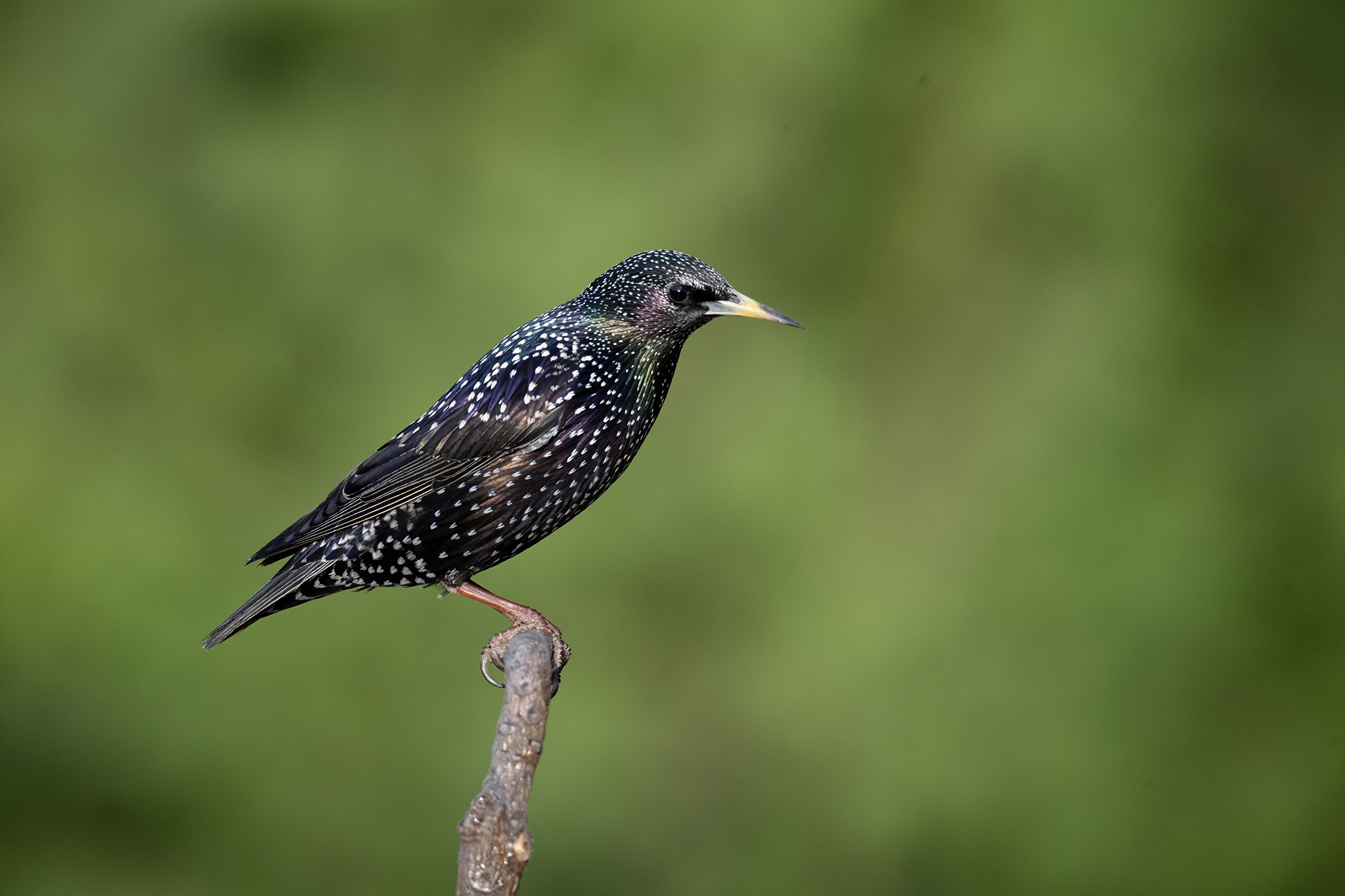 The Common Starling is medium-sized, similar to other small flocking birds, but its speckled winter plumage and metallic summer colors set it apart. Its walking movement and noisy, social behavior also help in identifying it.