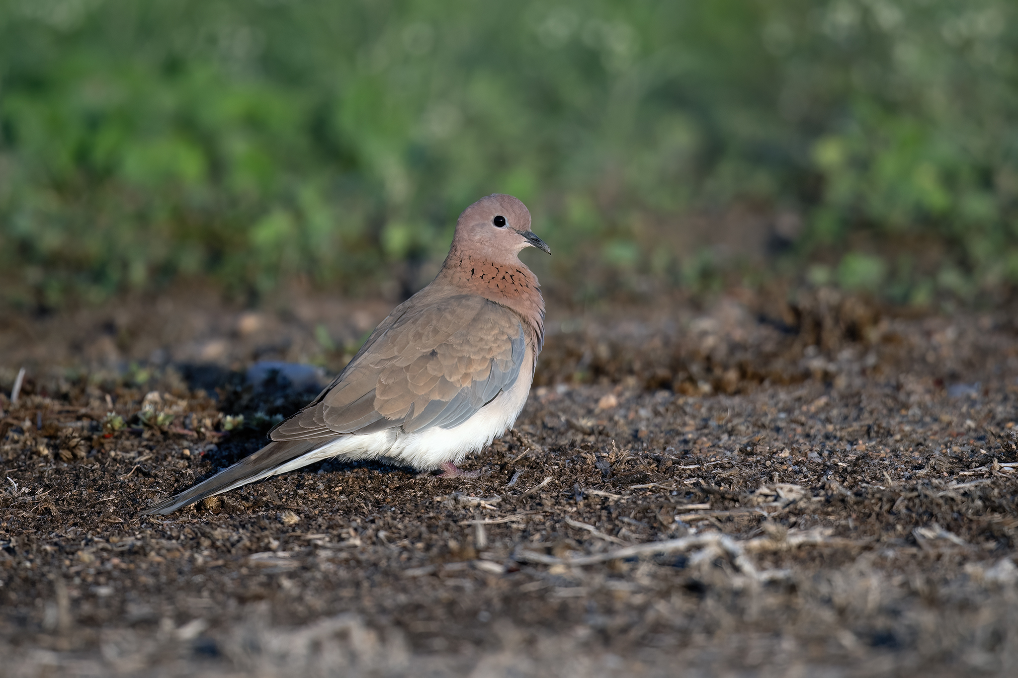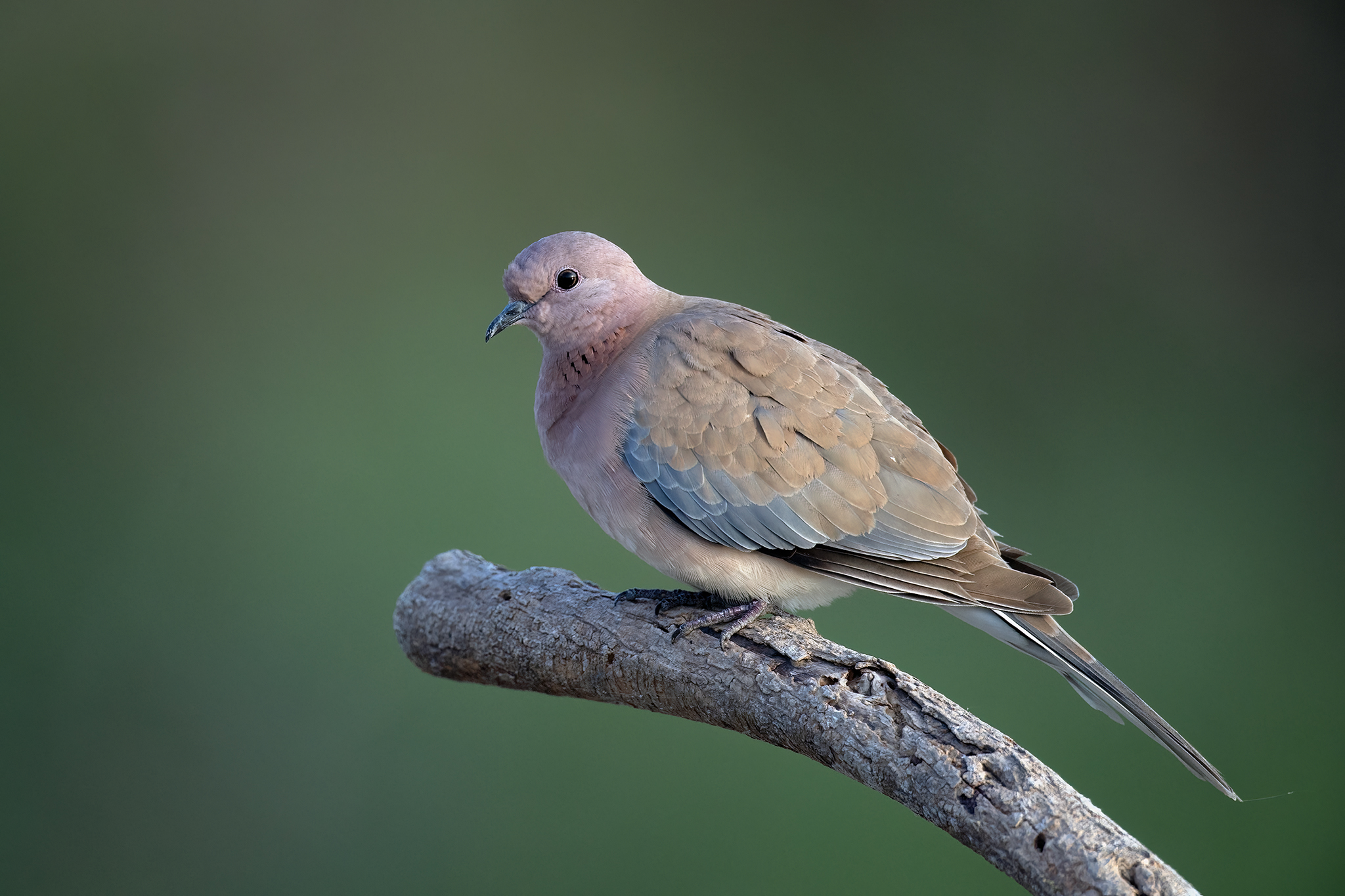 The Laughing Dove is a small and slender dove, smaller and more delicate compared to the Eurasian Collared Dove. Its intricate plumage makes it a standout species when seen up close.